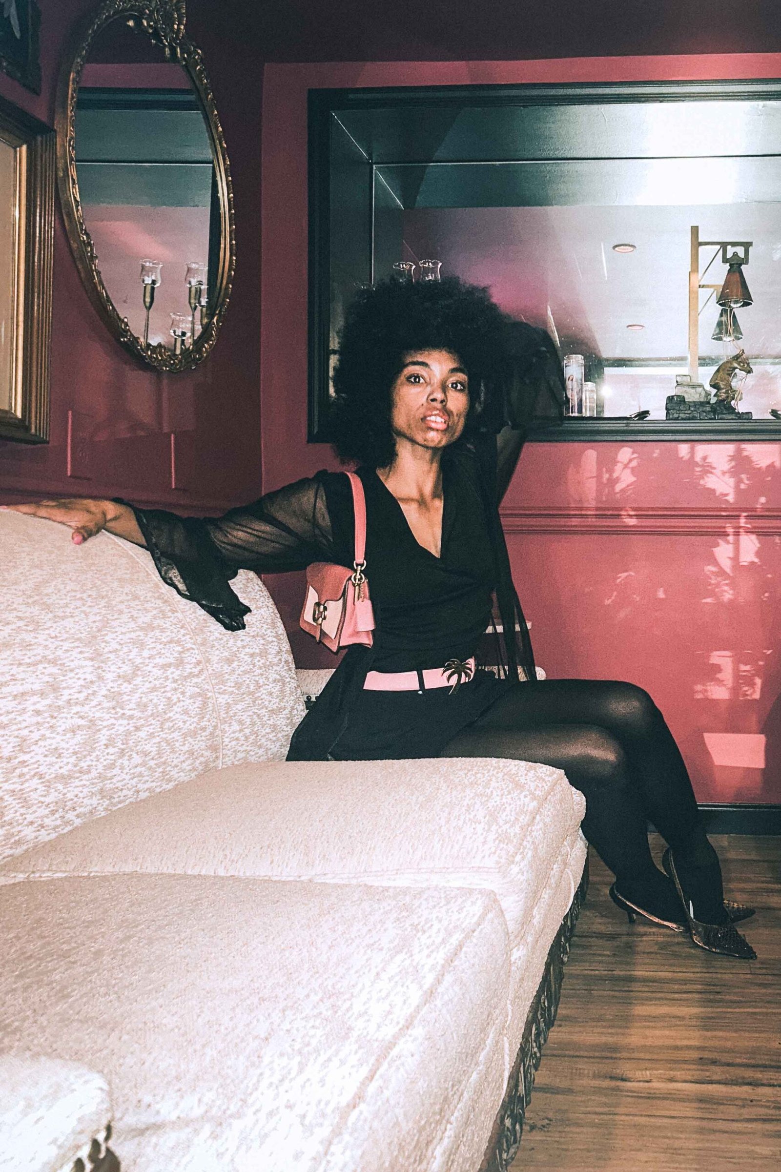 Woman in black dress with sheer sleeves, pink Palm Angels belt, and coral Coach clutch sitting on cream sofa in pink-walled lounge.
